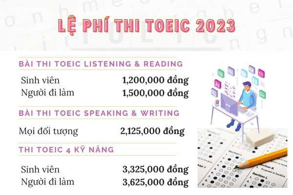 Đối với những người đi làm, lệ phí thi lên tới 1.550.000 VNĐ, trong khi sinh viên và học sinh thì chỉ mất 1.350.000 VNĐ nếu có thẻ HS-SV. Khi nộp lệ phí cho kỳ thi 4 kỹ năng, mức phí là 3.565.000 VNĐ cho sinh viên và 3.765.000 VNĐ cho người đi làm. Các bạn cũng nên cập nhật lệ phí cho từng kỹ năng riêng, như TOEIC Speaking hay Writing, thường rơi vào khoảng 1.750.000 VNĐ.