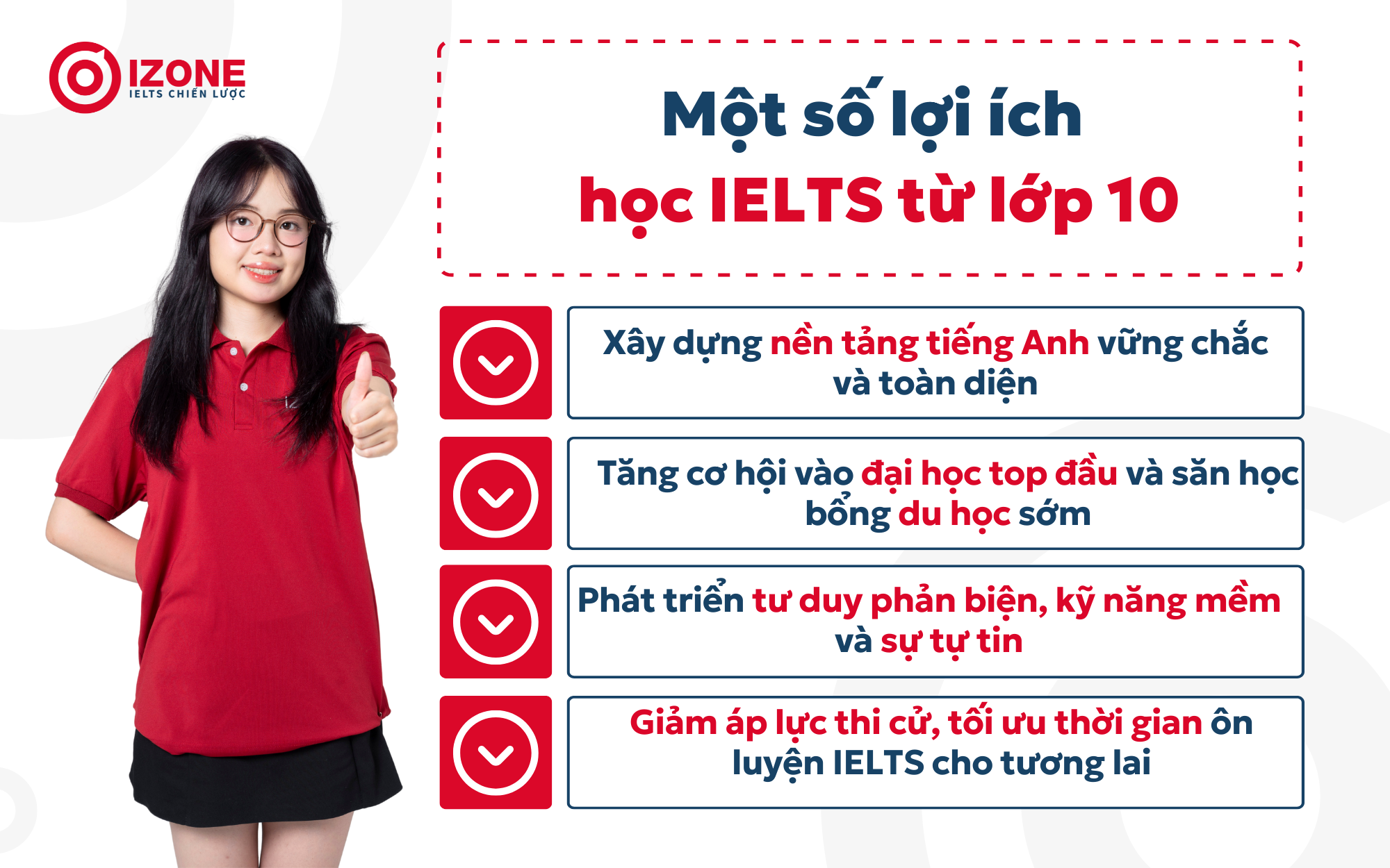 Ngoài ra, khi chuẩn bị cho IELTS, các em cần chú trọng vào việc mở rộng từ vựng và luyện tập chiến thuật làm bài. Bởi vì IELTS có tính học thuật cao, nó đòi hỏi người học không chỉ sở hữu kiến thức ngôn ngữ mà còn cả kiến thức về văn hóa, xã hội. Do đó, hãy bắt đầu hành trình học IELTS ngay từ lớp 10 để trang bị cho mình những kỹ năng cần thiết cho tương lai.