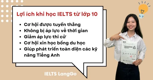 Học IELTS từ lớp 10 mang lại nhiều lợi ích. Đây là thời điểm lý tưởng, khi các em đã có nền tảng tiếng Anh cơ bản, đồng thời có thêm thời gian để củng cố kiến thức trước kỳ thi tốt nghiệp. Việc này không chỉ giúp các em nâng cao kỹ năng ngôn ngữ mà còn hỗ trợ trong việc học tập sau này.