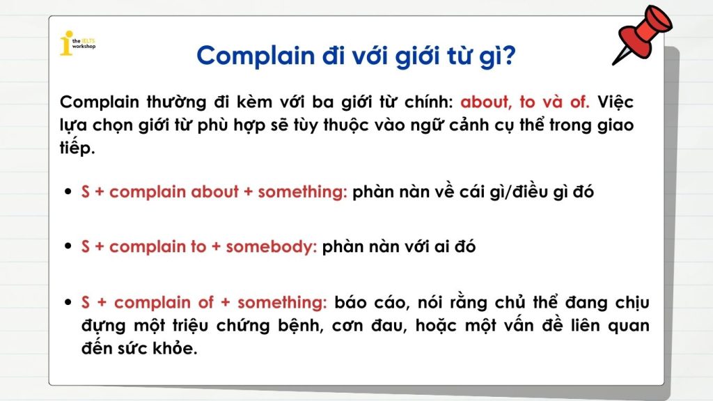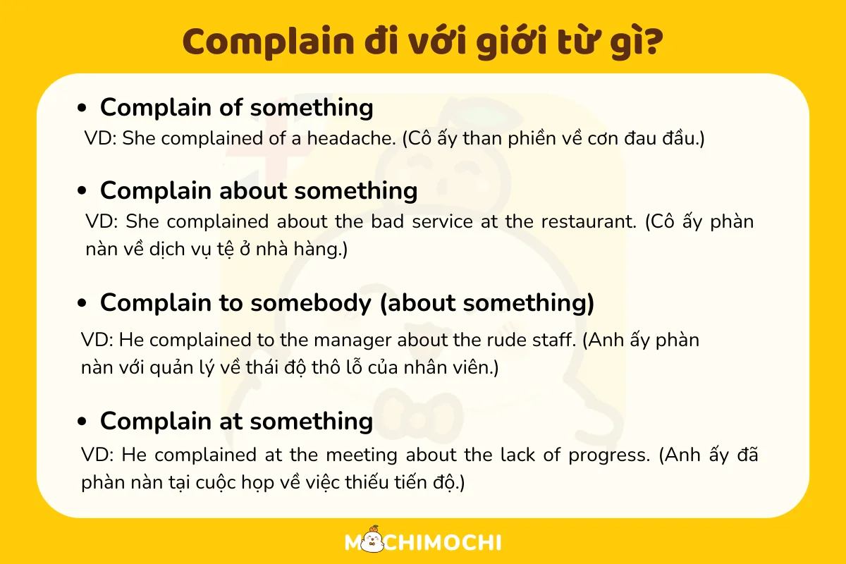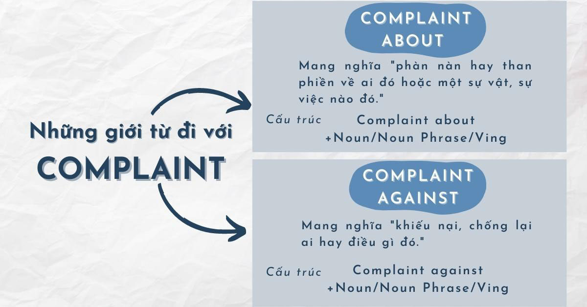 Khi sử dụng từ “complain,” một trong những cấu trúc phổ biến nhất là “complain about.” Cấu trúc này thường được dùng khi bạn muốn phàn nàn về một điều gì đó cụ thể, như “I want to complain about the noise.” Việc chọn đúng giới từ rất quan trọng để câu của bạn trở nên rõ ràng và tự nhiên hơn.