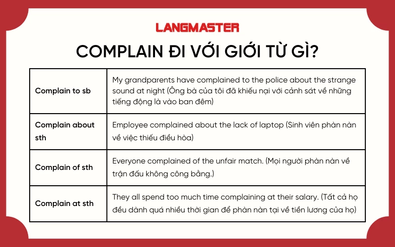Trong tiếng Anh, để diễn đạt ý “phàn nàn”, từ “complained” được sử dụng rất phổ biến. Tuy nhiên, khi sử dụng “complained” bạn cần lưu ý kết hợp với các giới từ khác nhau như “about”, “of”, “to” để truyền tải các ý nghĩa chính xác trong từng ngữ cảnh. Vậy “complained” đi với giới từ gì và ý nghĩa cũng như cấu trúc câu chứa “complained” ra sao? Bài viết dưới đây sẽ giúp bạn hiểu rõ hơn về cách dùng, các cấu trúc và phân biệt ý nghĩa của “complained” khi đi với từng giới từ, kèm theo ví dụ minh họa cụ thể.