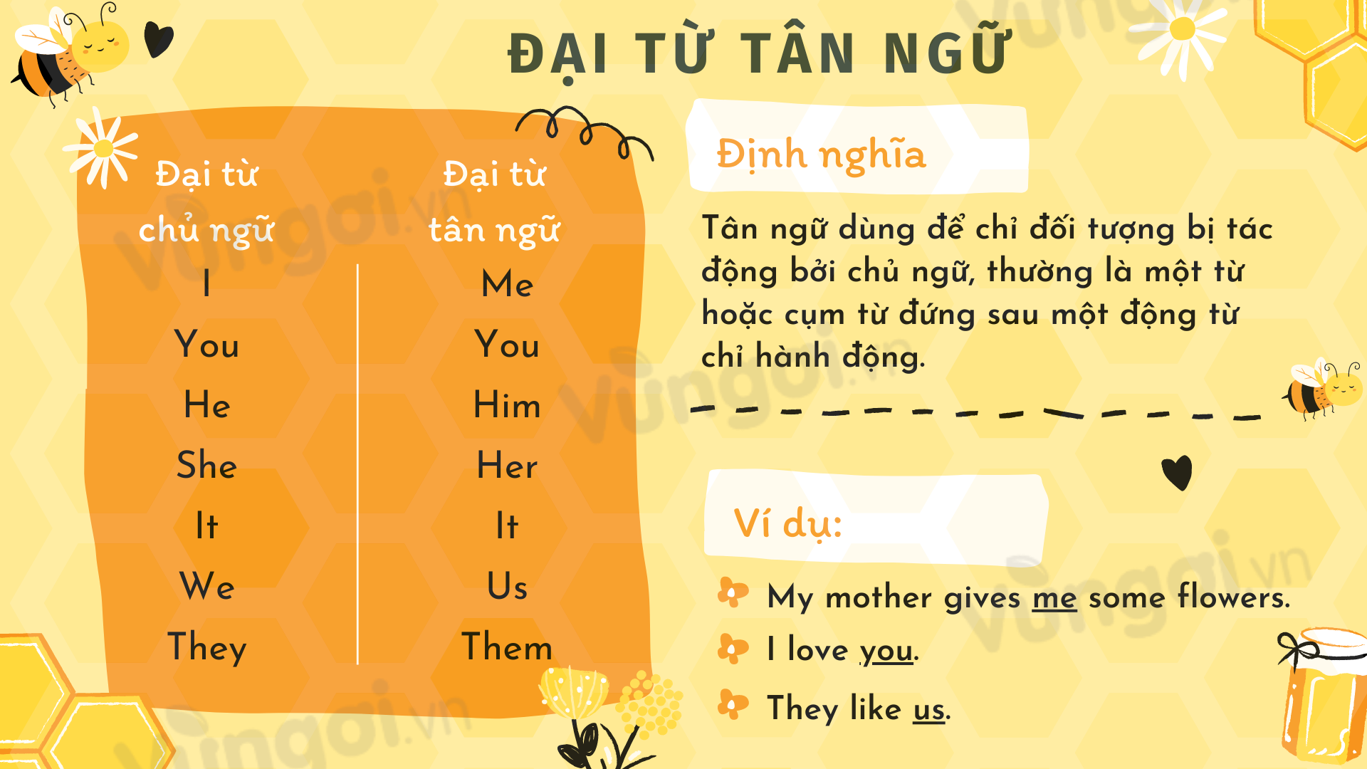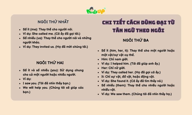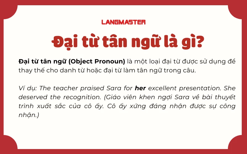 Đại từ tân ngữ, hay còn gọi là object pronouns trong tiếng Anh, là những từ dùng để thay thế cho danh từ đã được nhắc đến, thường là những người hoặc vật chịu sự tác động của một hành động. Các đại từ này bao gồm: me, you, him, her, it, us, them. Sử dụng đại từ tân ngữ giúp câu văn trở nên ngắn gọn và tự nhiên hơn.