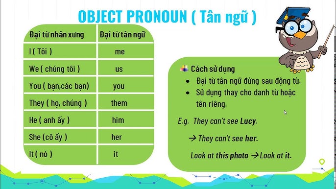 Đại từ tân ngữ (object pronoun) trong tiếng Anh rất quan trọng, với các từ như me, him, her, us, them và whom. Chúng được sử dụng để thay thế cho danh từ chỉ người hoặc vật, đóng vai trò tân ngữ trong câu. Khi sử dụng đại từ tân ngữ, câu sẽ trở nên ngắn gọn và dễ hiểu hơn, tránh sự lặp lại không cần thiết.
