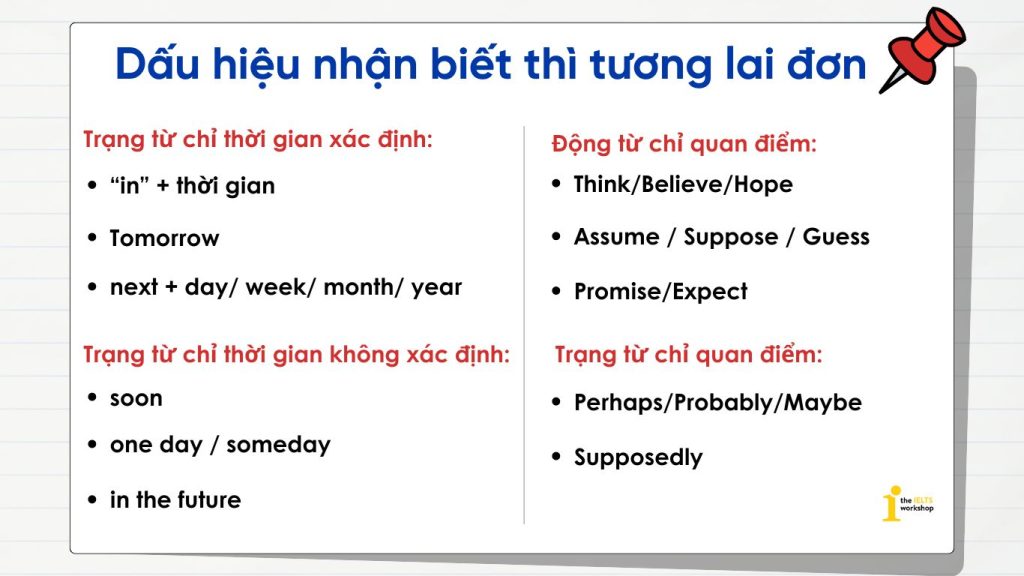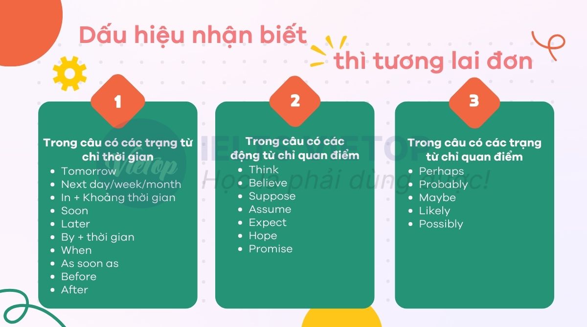 Trong việc nhận biết thì tương lai đơn, có một số dấu hiệu quan trọng. Những từ như “probably,” “maybe,” hay “supposedly” thường xuất hiện để thể hiện sự không chắc chắn. Ngoài ra, những động từ như “think,” “believe,” hay “suppose” cũng là dấu hiệu cho thấy chúng ta đang dự đoán điều gì đó trong tương lai.