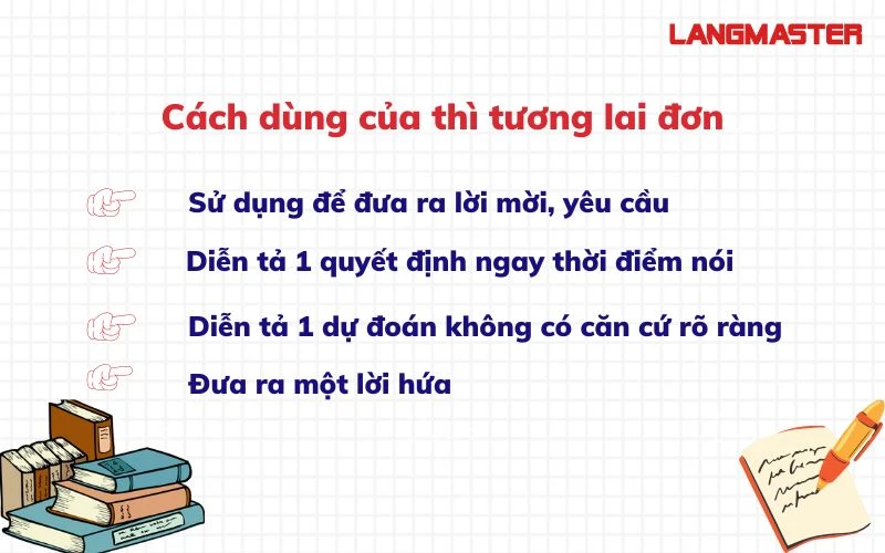Thì tương lai đơn thường được dùng để dự đoán những điều sẽ xảy ra mà không có căn cứ cụ thể. Ví dụ, bạn có thể nói “It will rain tomorrow,” để dự đoán thời tiết. Ngoài ra, nó cũng được sử dụng khi bạn đưa ra một quyết định tức thì, như trong câu “I will call you back” khi bạn quyết định gọi lại ngay lập tức.