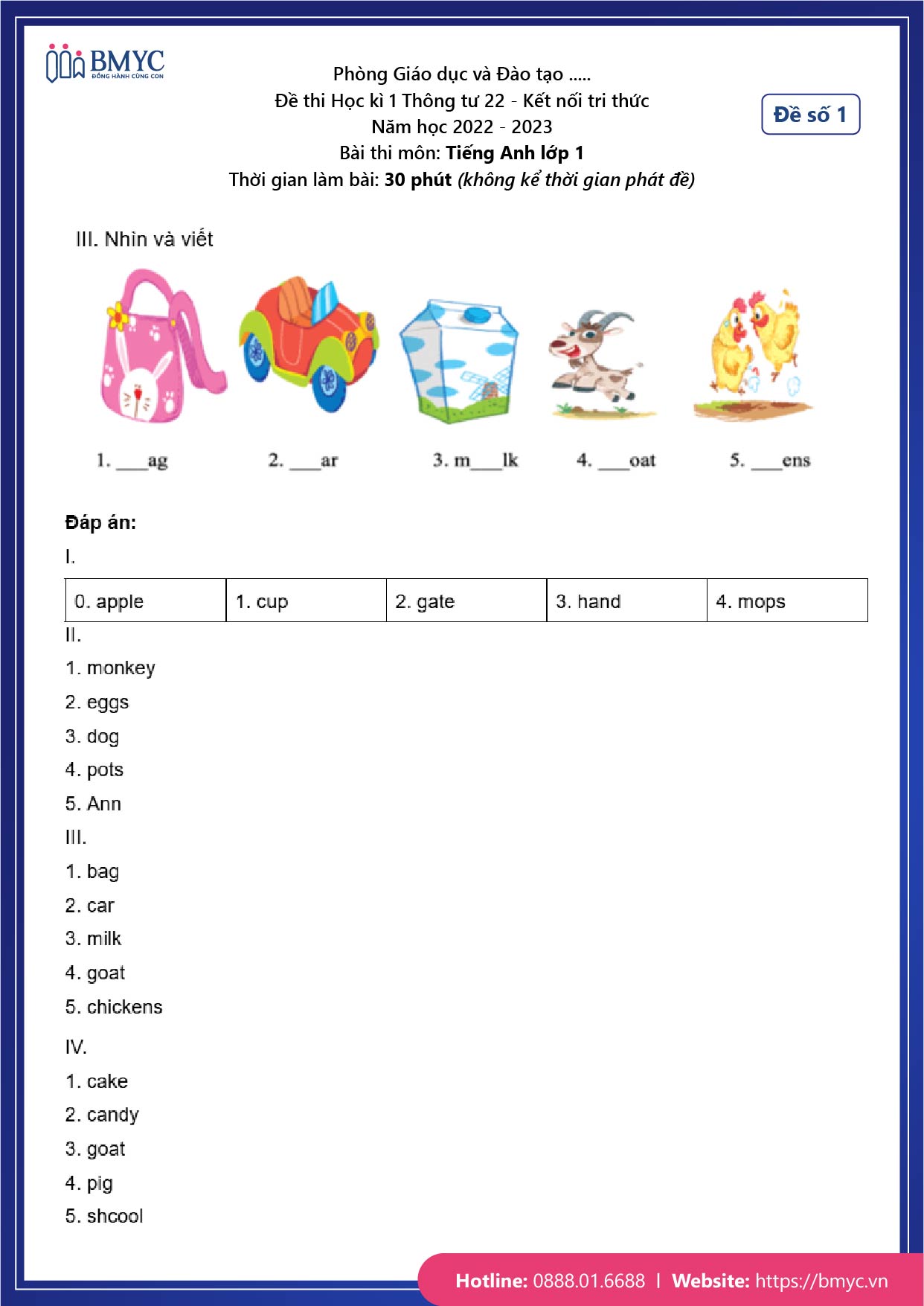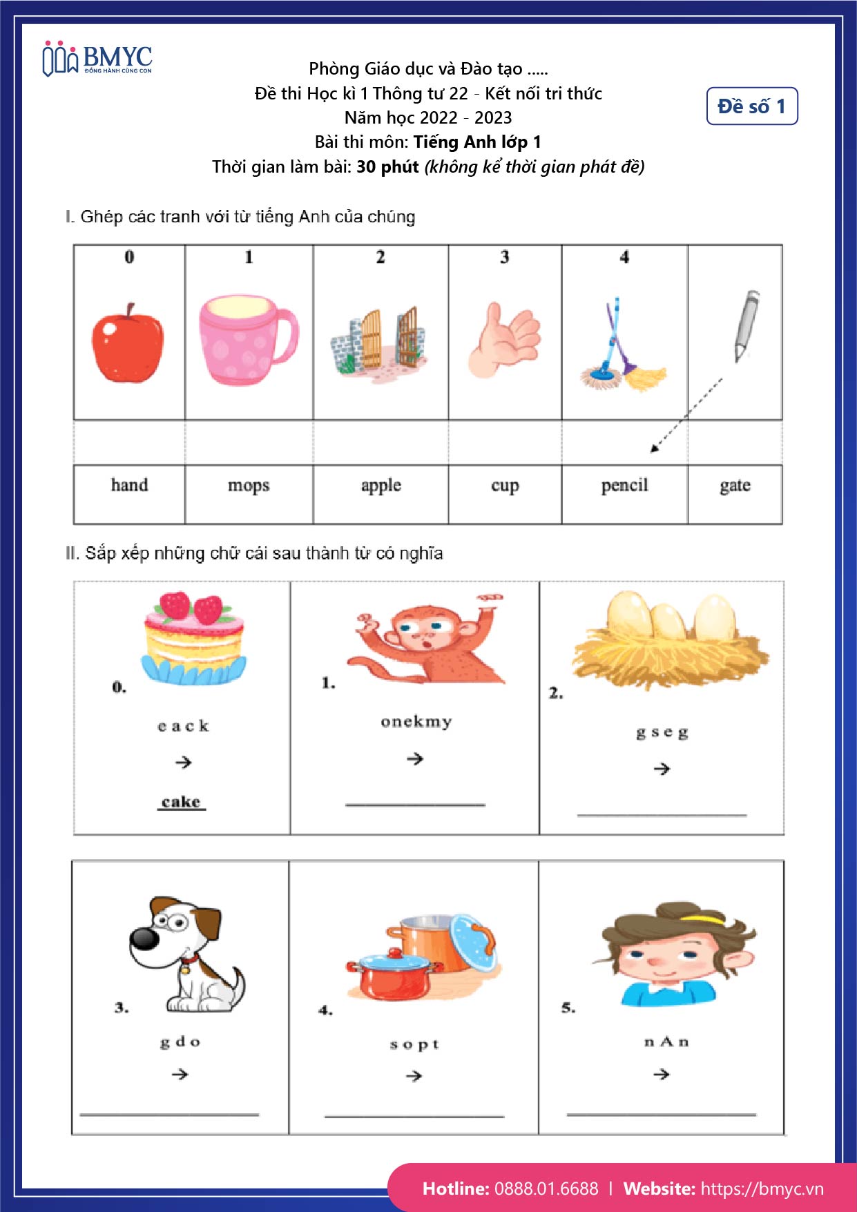 Bộ 100 Đề thi Tiếng Anh lớp 1 được thiết kế cho học kỳ 1 và học kỳ 2 năm 2025 rất đa dạng và phong phú. Những đề thi này không chỉ giúp các em học sinh làm quen với cấu trúc bài kiểm tra mà còn củng cố kiến thức theo chương trình học mới như sách Global Success hay Cánh Diều. Chúng tôi khuyến khích phụ huynh cùng đồng hành với con em trong việc ôn tập, bởi đây chính là bước đệm vững chắc cho trẻ tự tin tham gia kỳ thi.