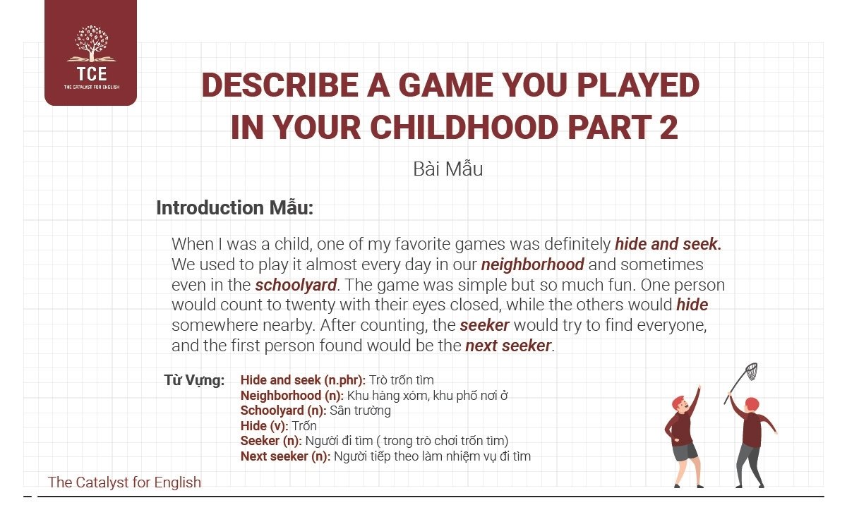 Một trong những trò chơi mà tôi rất yêu thích khi còn nhỏ là “Trốn tìm.” Đây là một trò chơi cổ điển mà tôi và bạn bè thường chơi sau giờ học hoặc vào những buổi chiều cuối tuần. Trò chơi bắt đầu khi một người trong nhóm bắt đầu đếm đến ba mươi, trong khi những người còn lại sẽ chạy đi tìm chỗ ẩn nấp.
