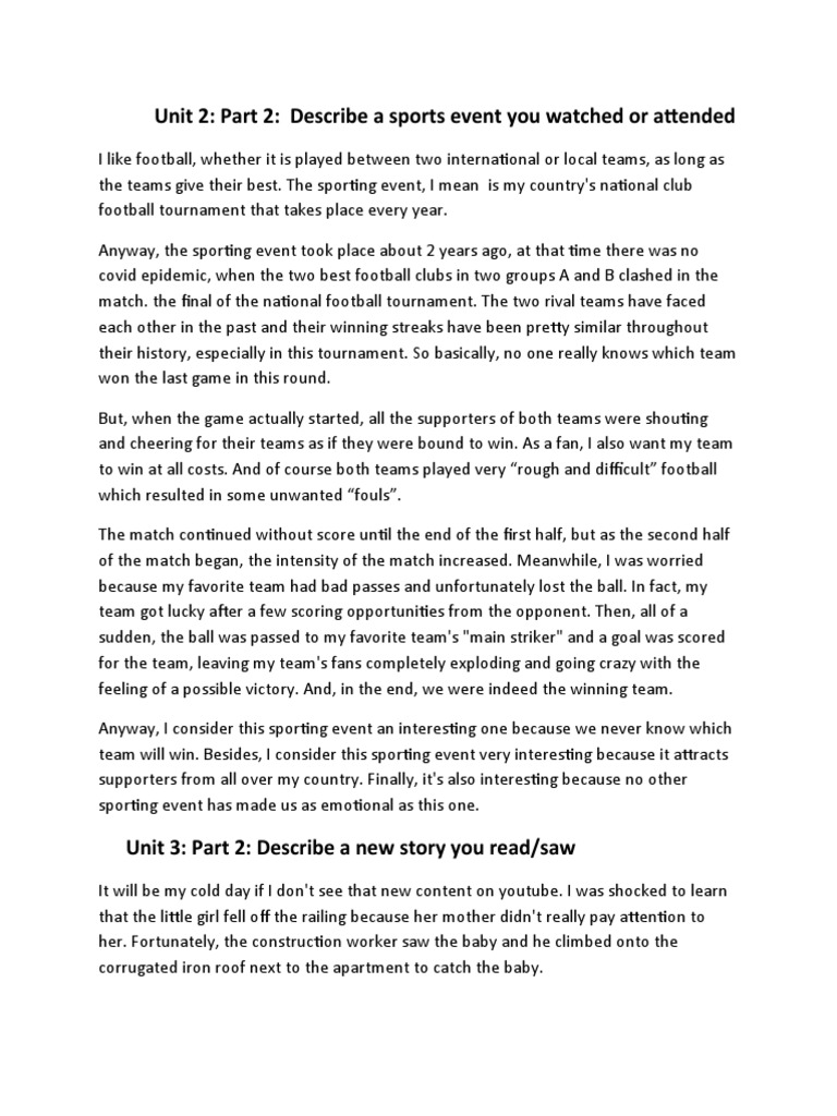 Một trong những sự kiện thể thao gây hồi hộp nhất mà tôi đã chứng kiến là trận đấu bóng đá giữa Hà Nội và thành phố Hồ Chí Minh. Đó là một buổi chiều đầy nắng, sân vận động chật kín khán giả. Không khí thật sự sôi động với tiếng cổ vũ, tiếng trống vang lên rộn rã, khiến tôi không thể không lôi cuốn vào trận đấu.