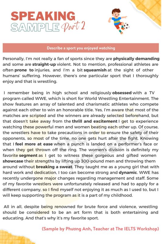 Một sự kiện thể thao mà tôi rất thích là Giải vô địch U23 châu Á diễn ra vào năm 2018. Tôi đã xem nó trên truyền hình cùng với gia đình, và không khí thực sự rất sôi động. Chúng tôi cùng nhau cổ vũ cho đội tuyển, cảm nhận sự hồi hộp qua từng pha bóng.