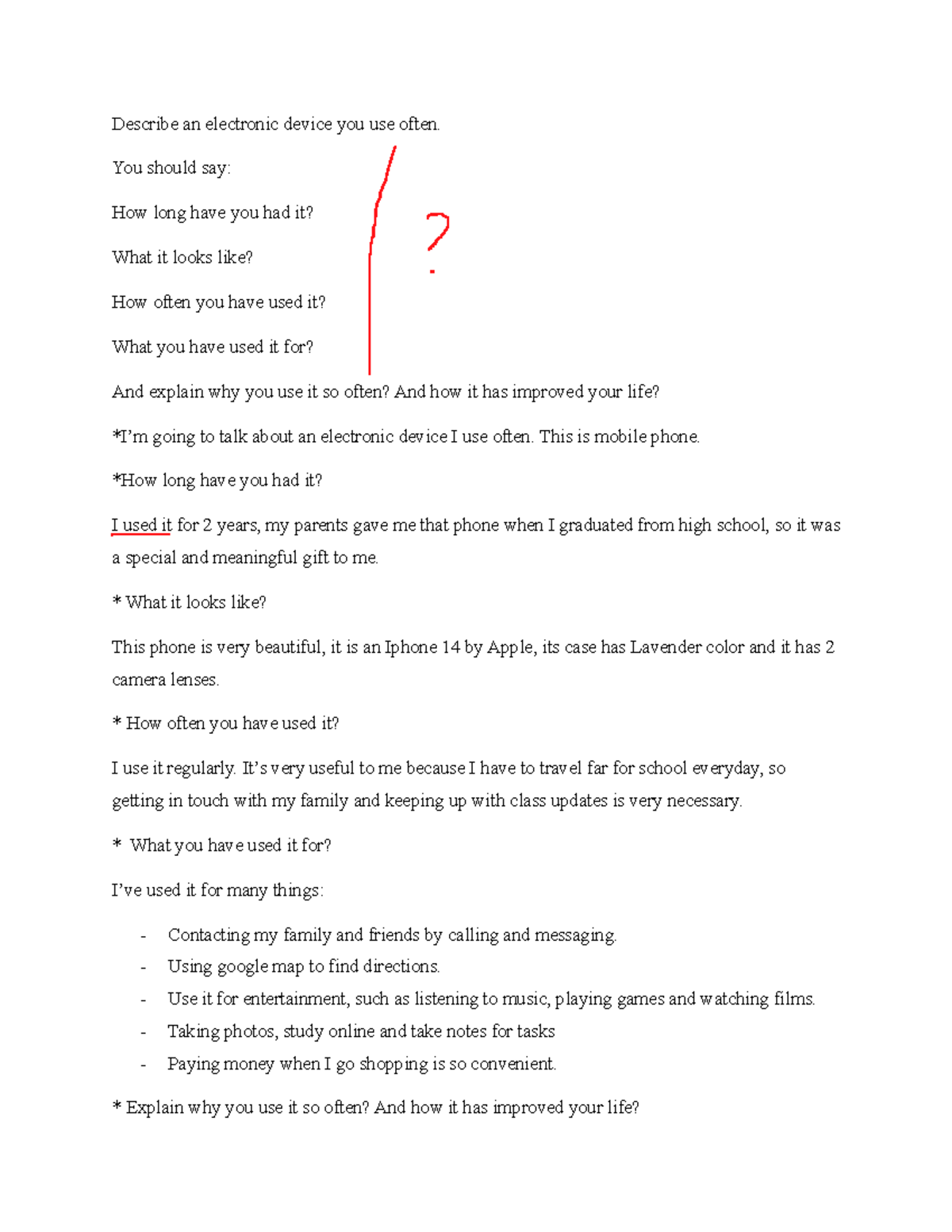 Smartphone là một trong những thiết bị điện tử quan trọng nhất trong cuộc sống hàng ngày của tôi. Nó không chỉ giúp tôi giữ liên lạc với bạn bè và gia đình thông qua các cuộc gọi và ứng dụng nhắn tin, mà còn là công cụ giúp tôi tổ chức và làm việc hiệu quả hơn. Tôi thường xuyên sử dụng nó để lên lịch công việc, quản lý thời gian và tạo ghi chú.