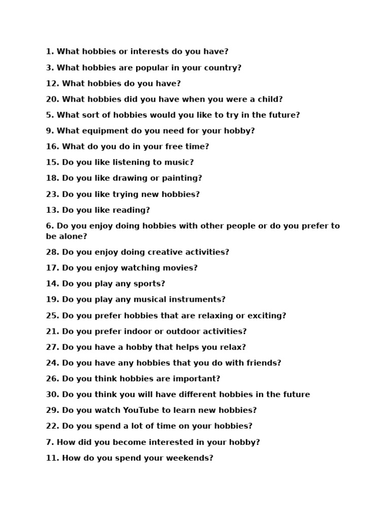 Đối với tôi, mọi người nên có sở thích, vì chúng cung cấp sự kích thích trí não và giúp chúng ta phát triển bản thân. Một sở thích thú vị có thể cải thiện tâm trạng, rèn luyện khả năng kiên cường và nâng cao cảm giác về bản thân.