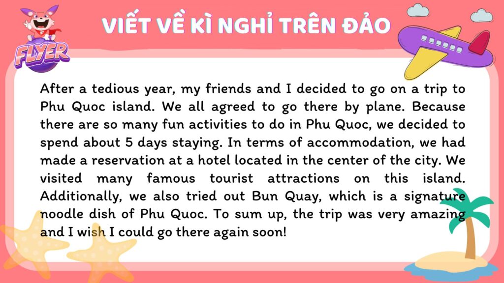 Chào bạn! Tháng tới, chúng mình đang lên kế hoạch cho một kỳ nghỉ tuyệt vời ở bãi biển. Chúng mình sẽ ở tại khách sạn Binh Minh, một nơi rất đẹp và thoải mái, gần sát biển. Khi nghĩ về kỳ nghỉ, mình cảm thấy hồi hộp và mong chờ được thư giãn giữa cái nắng vàng rực rỡ.