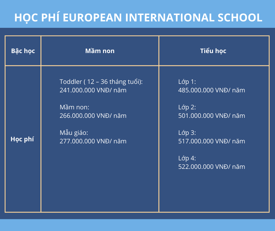 Khi nhắc đến European International School (EIS) ở Việt Nam, nhiều phụ huynh quan tâm đến mức học phí. Tại EIS, học phí có thể dao động tùy theo cấp độ học tập. Ví dụ, đối với chương trình dành cho trẻ em ở độ tuổi Toddler, học phí hàng năm vào khoảng 268,200,000 VND. Đối với các cấp độ cao hơn như Kindergarten và Pre-School, học phí cũng tăng dần. EIS cung cấp các chương trình IB toàn diện, giúp học sinh phát triển không chỉ về kiến thức mà còn về kỹ năng tư duy và giao tiếp.