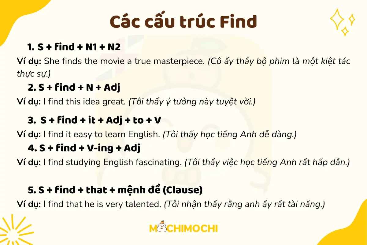 Nói tóm lại, việc tìm hiểu các cấu trúc với “find” sẽ giúp bạn mở rộng cách diễn đạt và chia sẻ cảm xúc một cách tự nhiên hơn trong giao tiếp hàng ngày. Hãy thử áp dụng vào các tình huống thực tế để cảm nhận nhé!
