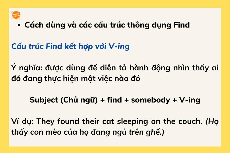 Ngoài ra, bạn cũng có thể sử dụng cấu trúc này để nói về việc bắt gặp ai đó đang làm gì, như trong câu “I found him sleeping on the couch.” Điều này không chỉ đơn giản là “tìm thấy” mà còn mang đến một hình ảnh sinh động về tình huống cụ thể.