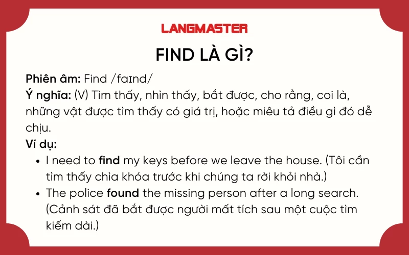 Trong tiếng Anh, động từ “find” mang nhiều ý nghĩa thú vị, không chỉ đơn thuần là “tìm thấy”. Ý nghĩa phổ biến nhất của nó là “tìm thấy, bắt gặp”. Chẳng hạn, khi bạn nói “I found him sleeping on the couch,” bạn đang mô tả việc bạn thấy ai đó đang làm gì trong một khoảnh khắc cụ thể.