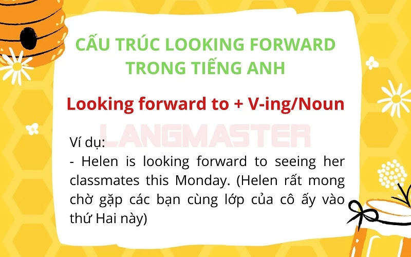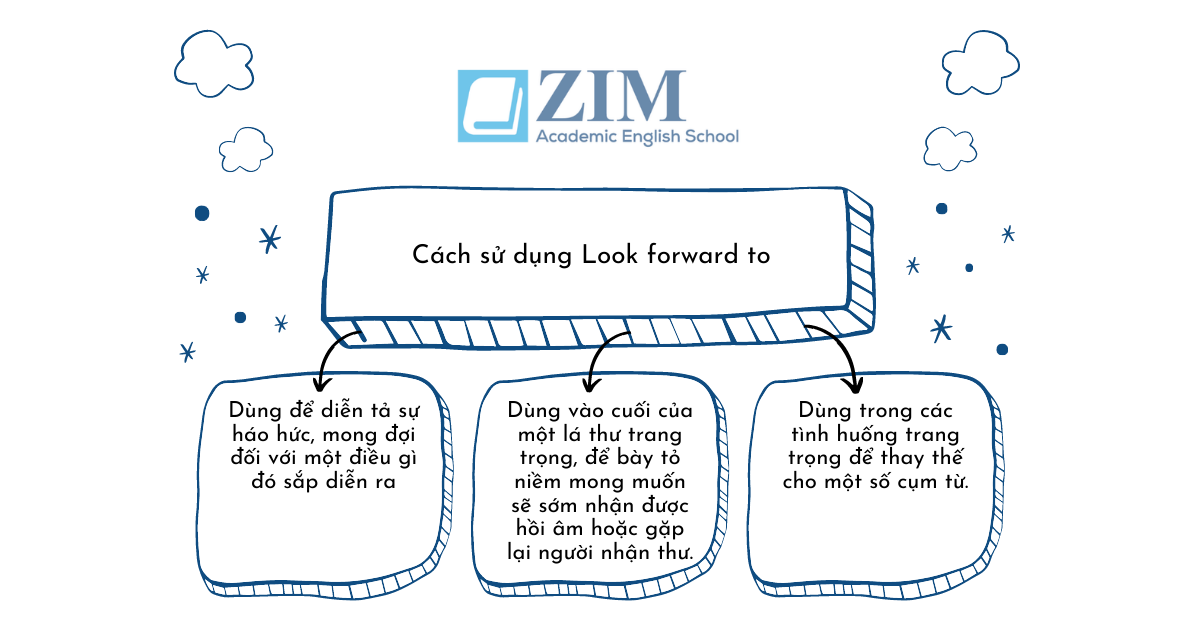 Trong tiếng Anh, cấu trúc “look forward to” không chỉ là một cách diễn đạt thú vị mà còn thể hiện tâm trạng háo hức của người nói. Sẽ có nhiều cách để sử dụng như “Looking forward to + V-ing” hay “I’m looking forward to + N”. Điều đặc biệt là sau “look forward” luôn đi kèm với giới từ “to”, theo sau là một danh từ hoặc động từ thêm “-ing”.