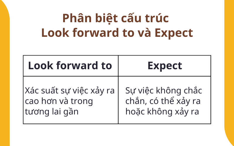 Trong khi “look forward” mang nghĩa mong đợi, thì nó khác với từ “expect” – một từ cùng nghĩa nhưng có phần nghiêm túc hơn. “Expect” thường thể hiện một niềm tin chắc chắn vào điều gì đó sẽ diễn ra, trong khi “look forward to” thể hiện sự phấn khích.