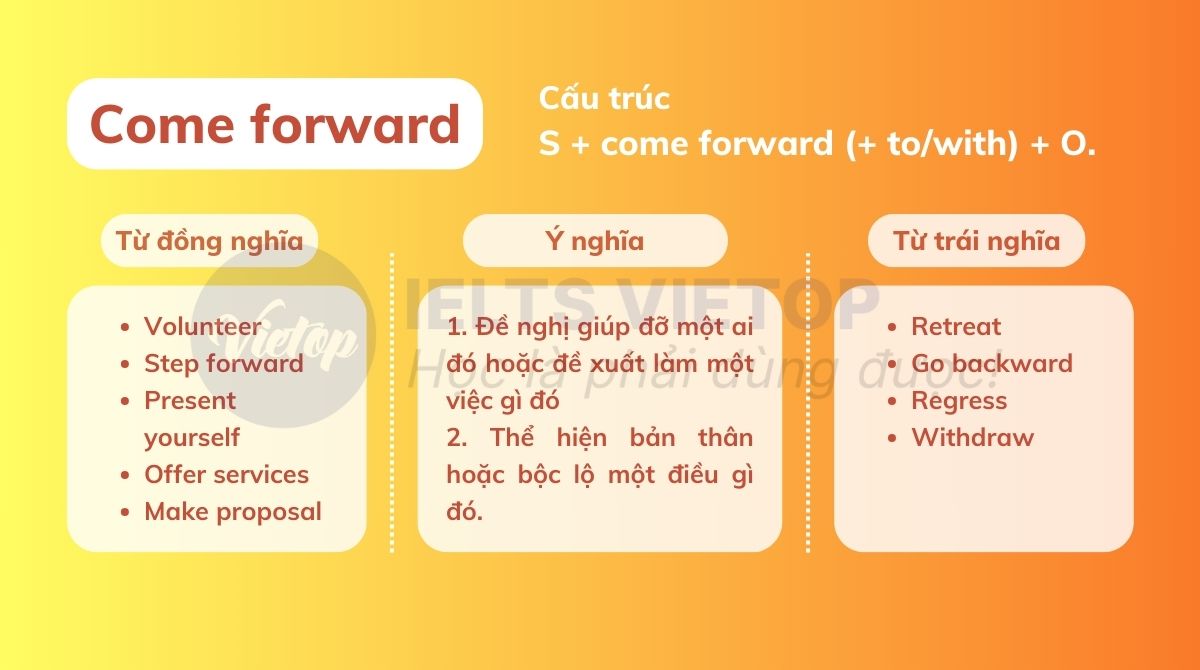 Ngoài ra, trong trường hợp cụm “come forward”, từ “forward” nhấn mạnh sự chủ động khi ai đó xuất hiện để cung cấp thông tin hay giúp đỡ. Điều này cho thấy một thái độ tích cực, thể hiện sự mong chờ và khát khao tiến lên phía trước, tương lai.