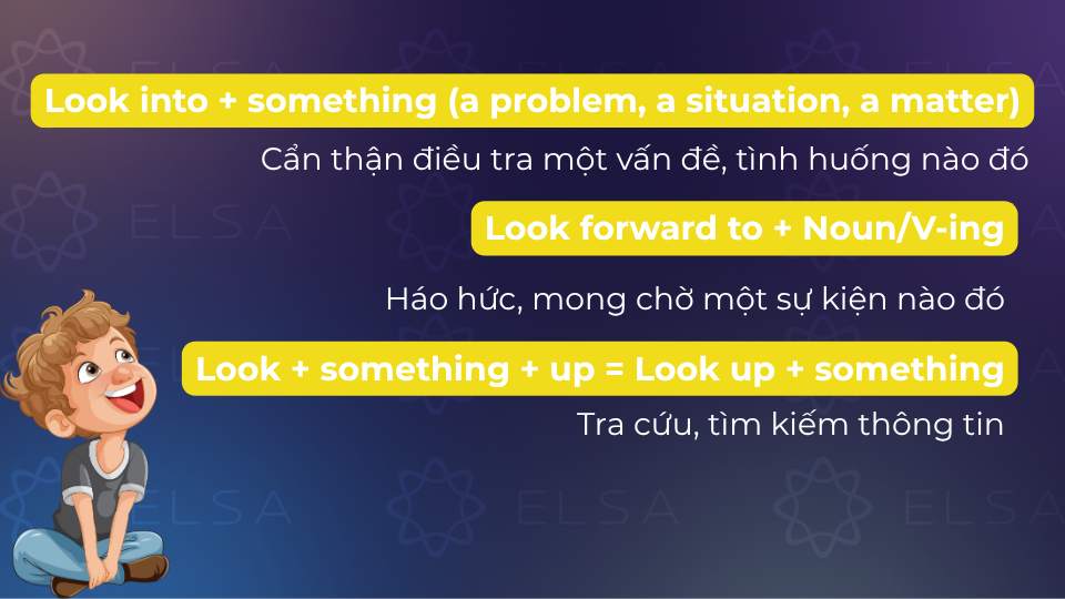 Một cụm từ phổ biến là “look forward to,” thường được dùng để thể hiện sự háo hức, mong đợi một sự kiện nào đó. Cấu trúc thường gặp là “Looking forward to + N/V-ing” hoặc “I look forward to + V-ing/N.” Sau “look forward” luôn có giới từ “to” và theo sau là danh từ hoặc động từ thêm “-ing”. Chẳng hạn, “I’m looking forward to traveling next summer.”