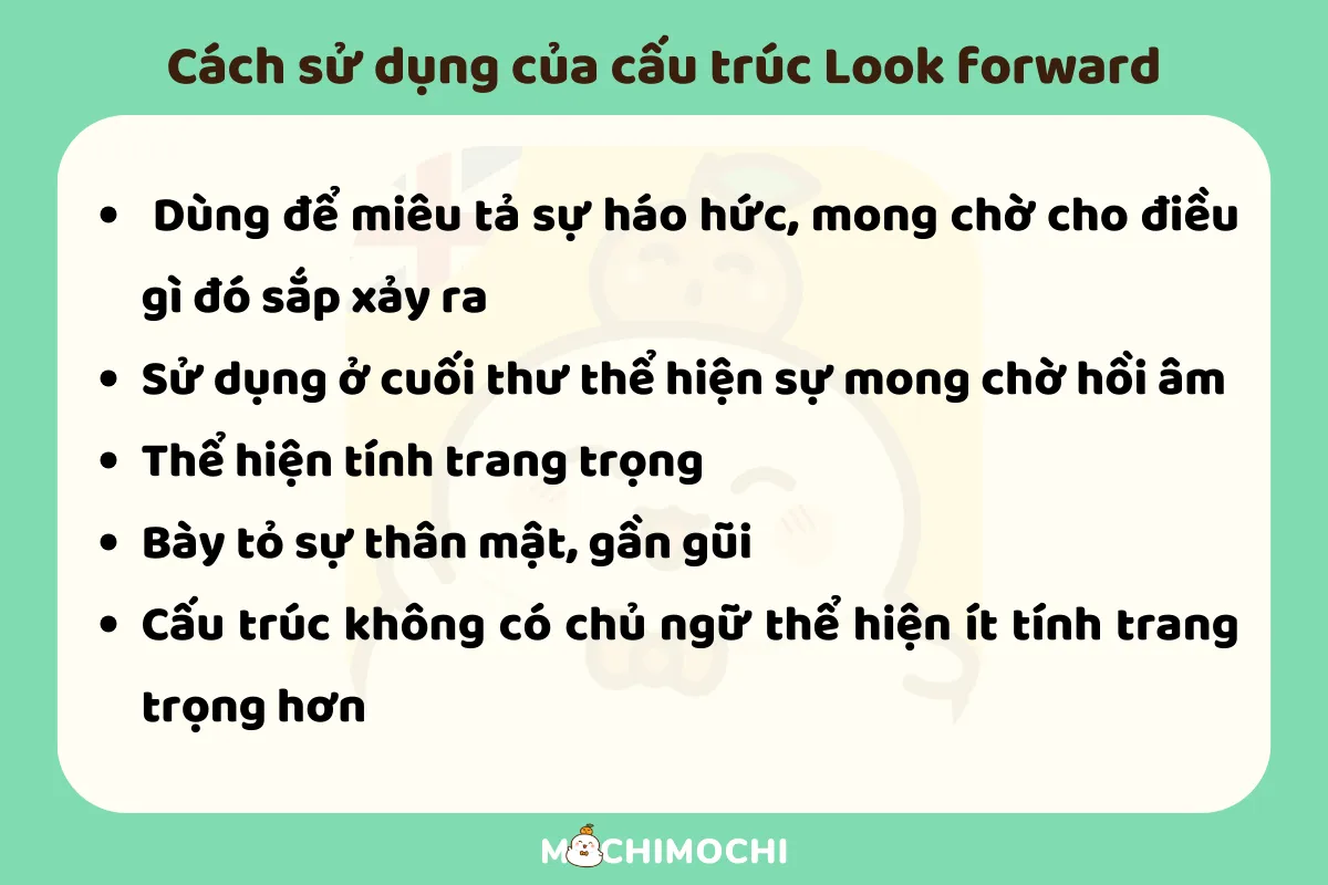 Khi sử dụng cụm này, cần nhớ rằng sau “to” phải là một động từ ở dạng danh động từ (V-ing), chẳng hạn như trong câu “I am looking forward to meeting you”. Sự kết hợp này giúp người nghe hiểu rõ hơn về cảm xúc cũng như sự kỳ vọng của người nói.