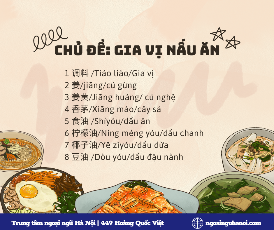 Gia vị là một phần không thể thiếu trong các món ăn, góp phần tạo nên hương vị riêng biệt và hấp dẫn cho ẩm thực. Đối với những ai đang học tiếng Trung hoặc yêu thích nền văn hóa Trung Hoa, việc hiểu và ghi nhớ tên các loại gia vị bằng tiếng Trung sẽ giúp quá trình học tập và giao tiếp trở nên dễ dàng hơn. Trong bài viết này, chúng ta sẽ cùng tìm hiểu về các loại gia vị trong tiếng Trung, tên gọi của chúng, cũng như những từ vựng liên quan để bổ sung thêm vốn từ cho bản thân khi học tiếng Trung.