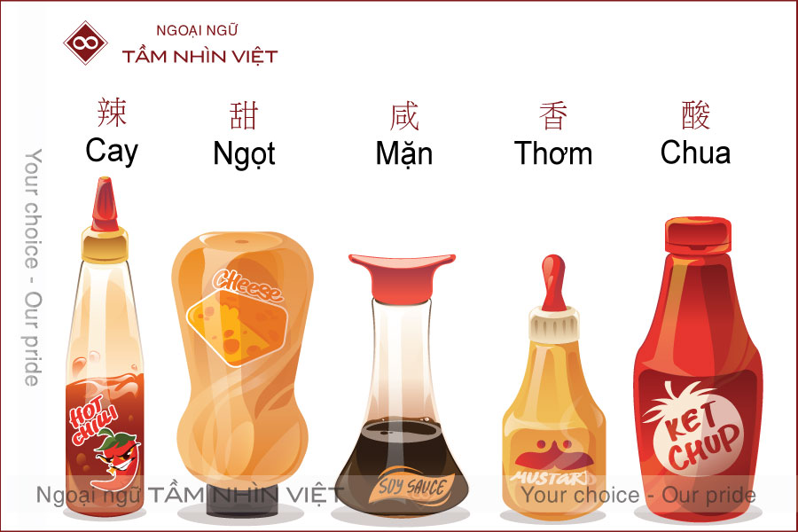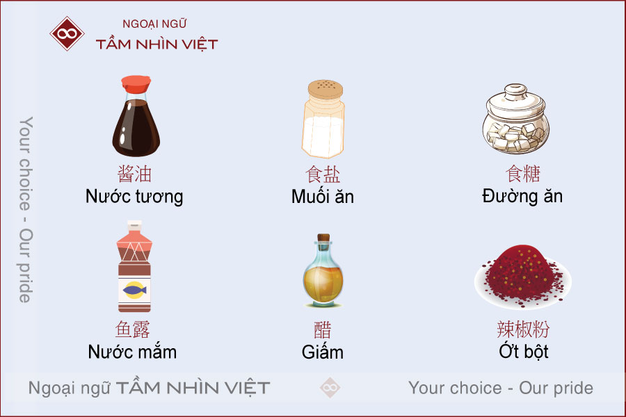Gia vị trong tiếng Trung là một phần quan trọng trong ẩm thực, không chỉ mang lại hương vị mà còn góp phần tạo nên bản sắc văn hóa ẩm thực của từng vùng miền. Một số loại gia vị phổ biến mà bạn nên biết bao gồm muối, được gọi là 盐 (yán), và các loại sốt, mắm, hay nước tương, gọi là 酱 (jiàng). Đường thì có tên là 糖 (táng), trong khi bột ngọt là 味精 (wèijīng), rất hữu ích trong việc làm tăng hương vị món ăn.