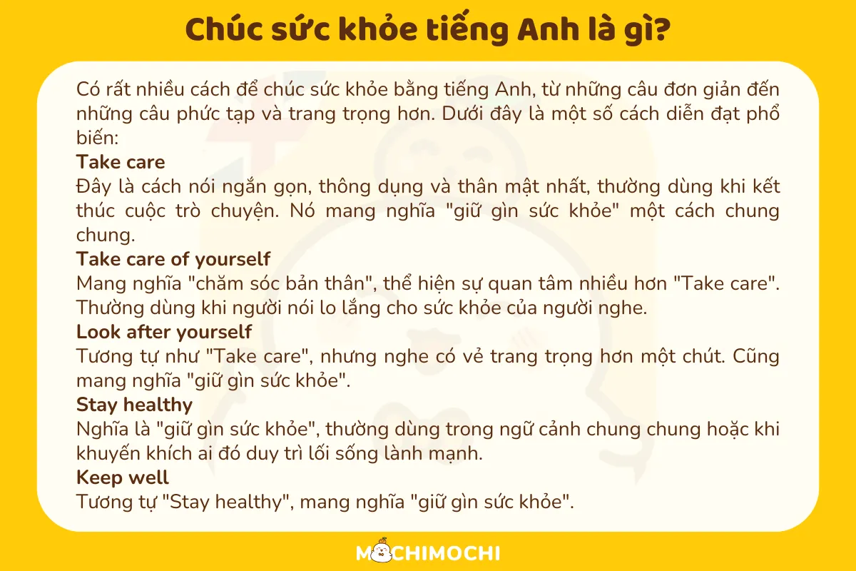 Hãy nhớ rằng, sức khỏe tốt giúp chúng ta có tinh thần phấn chấn, làm mọi việc dễ dàng hơn. Câu nói “Take care of yourself” (Hãy chăm sóc bản thân) rất gần gũi và thân mật, nhắc nhở chúng ta luôn đặt sức khỏe lên hàng đầu. Đừng quên rằng, một cuộc sống khỏe mạnh không chỉ mang lại hạnh phúc mà còn giúp chúng ta sống lâu hơn với những người thân yêu.