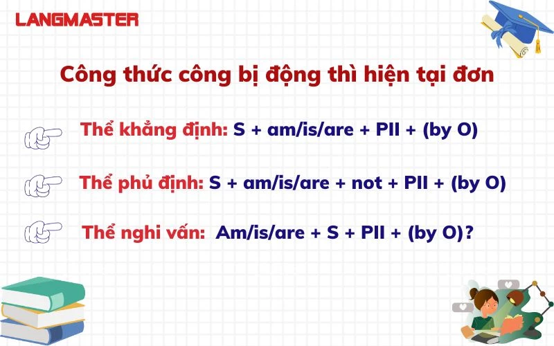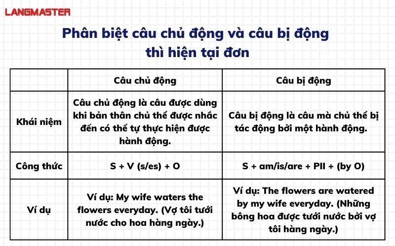 Công thức câu bị động ở hiện tại đơn rất quan trọng trong tiếng Anh. Để tạo câu bị động, bạn cần cấu trúc: S + am/is/are + V3 (động từ ở dạng quá khứ phân từ) + (by O). Chẳng hạn, khi bạn nói “The flowers are watered by my mother,” câu này thể hiện rằng mẹ của bạn là người thực hiện hành động tưới hoa.