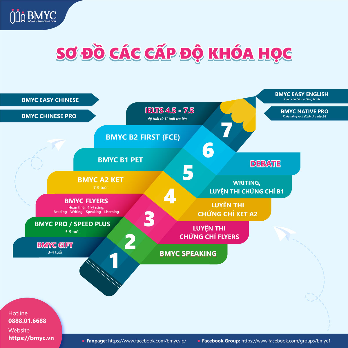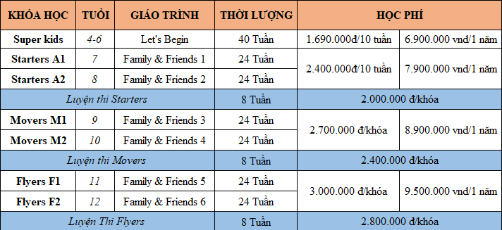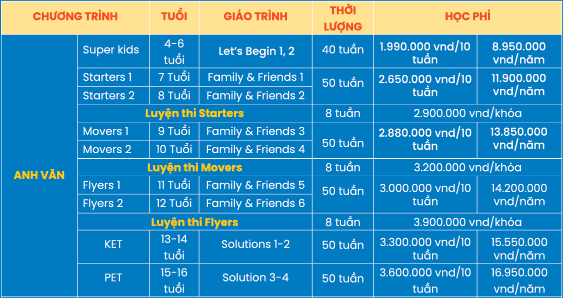 Mỗi khóa học thường được thiết kế phù hợp với từng độ tuổi và trình độ, giúp trẻ vừa học tiếng Anh vừa phát triển kỹ năng sống. Ngoài ra, các trung tâm thường có nhiều lựa chọn về số giờ học để phụ huynh dễ dàng cân đối tài chính và nhu cầu học tập của con. Một số trung tâm còn có chính sách ưu đãi như giảm học phí khi đăng ký nhiều học viên hoặc học viên cũ, thậm chí hỗ trợ học bổng cho trẻ em khó khăn.