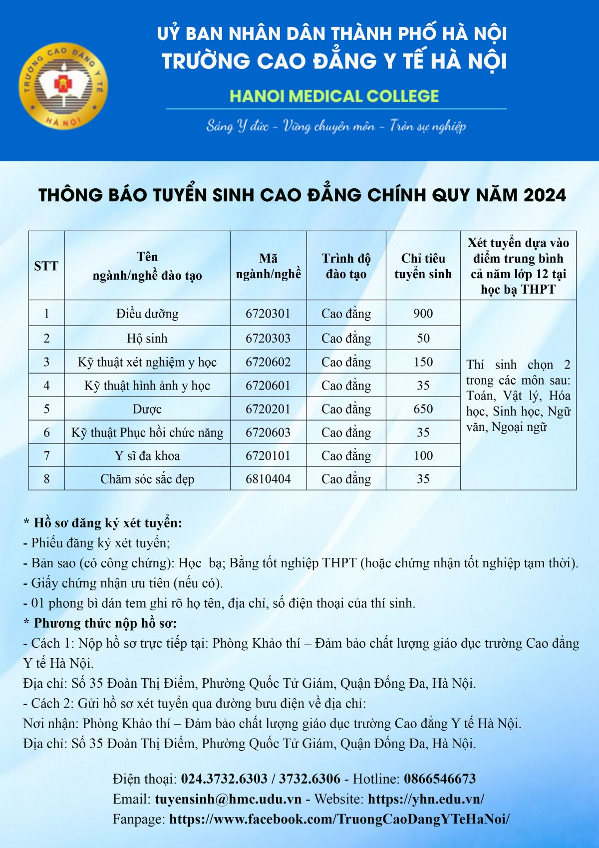 Hồ sơ đăng ký xét tuyển khá đơn giản, gồm phiếu đăng ký và bản sao công chứng bằng tốt nghiệp THPT hoặc giấy chứng nhận tốt nghiệp tạm thời. Nếu bạn đang quan tâm đến ngành y và muốn học trong môi trường đào tạo chuyên nghiệp, Cao đẳng Y Hà Nội là một lựa chọn đáng cân nhắc.