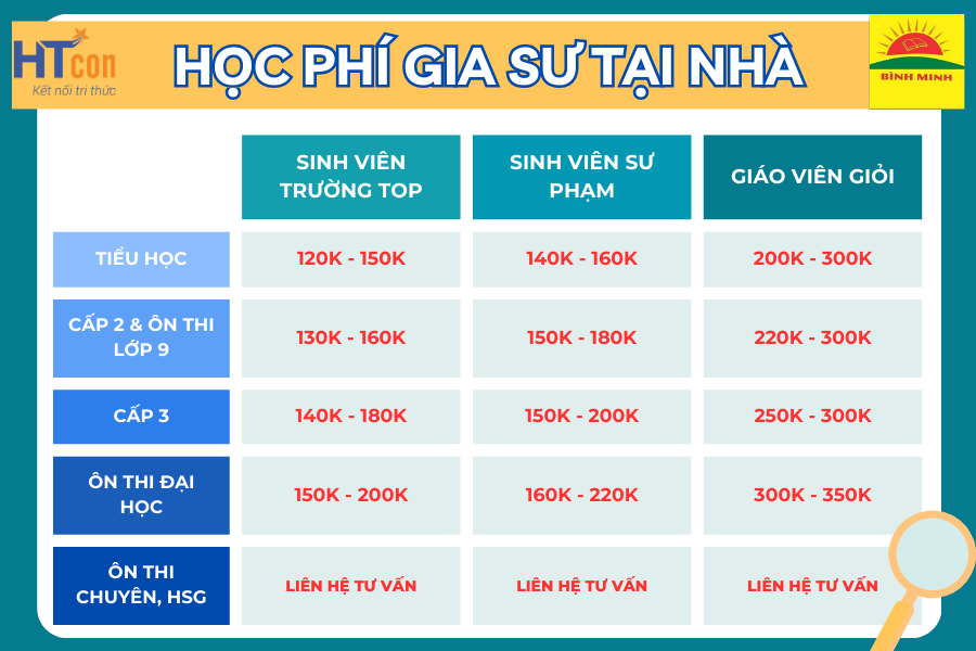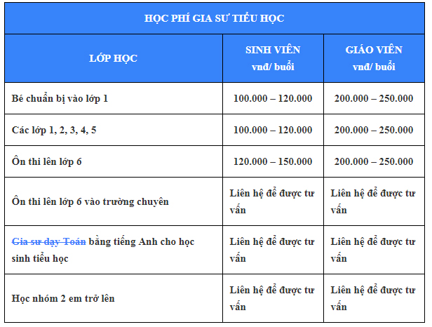 Việc lựa chọn gia sư phù hợp với nhu cầu và khả năng tài chính của gia đình là điều quan trọng. Bảng giá này chỉ mang tính tham khảo, vì còn tùy thuộc vào từng trung tâm và khu vực địa lý khác nhau. Tuy nhiên, với mức học phí hợp lý, việc học kèm tại nhà vẫn là lựa chọn hiệu quả giúp các em tiến bộ nhanh chóng trong học tập.