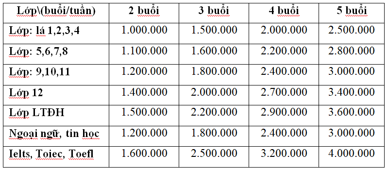 Với giáo viên đang giảng dạy tại các trường THCS, THPT, mức phí sẽ cao hơn, khoảng 3 đến 3,6 triệu đồng/tháng cho 3 buổi/tuần, mỗi buổi 90 phút. Còn nếu thuê giáo viên tự do, học phí thường rơi vào khoảng 2,5 đến 3 triệu đồng/tháng với thời lượng tương tự. Đối với các lớp ôn thi cấp tốc hoặc nâng cao, học phí có thể điều chỉnh tăng thêm tùy theo yêu cầu cụ thể.