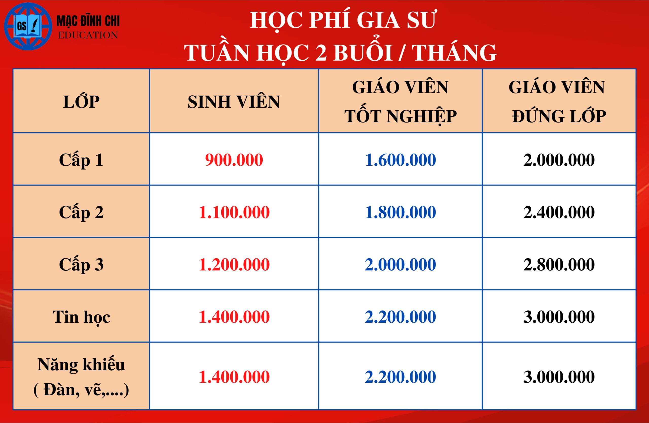 Hiện nay, việc thuê gia sư dạy kèm tại nhà đã trở thành lựa chọn phổ biến của nhiều phụ huynh muốn con em mình học tập hiệu quả hơn. Học phí gia sư phụ thuộc vào nhiều yếu tố như trình độ của người dạy (sinh viên hay giáo viên), số buổi học mỗi tuần và cấp lớp của học sinh. Ví dụ, với cấp tiểu học, mức phí tham khảo cho sinh viên dạy 2 buổi/tuần khoảng 1.100.000 – 1.200.000 đồng/tháng, còn giáo viên sẽ cao hơn, từ 1.500.000 – 1.600.000 đồng/tháng. Các lớp cao hơn như THCS, THPT thì học phí cũng tăng dần theo độ khó của chương trình.