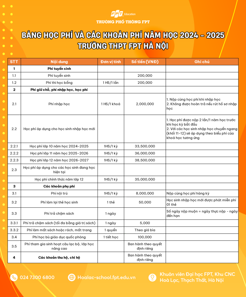Khi lựa chọn trường đại học, học phí luôn là yếu tố quan trọng được nhiều thí sinh và phụ huynh quan tâm, đặc biệt với các trường đại học ngoài công lập như Đại học FPT Hà Nội. Với chương trình đào tạo hiện đại, môi trường học tập quốc tế cùng nhiều chính sách hỗ trợ tài chính hấp dẫn, mức học phí tại FPT Hà Nội luôn là chủ đề nhận được nhiều sự chú ý. Bài viết dưới đây sẽ tổng hợp chi tiết về học phí Đại học FPT Hà Nội năm 2024, học phí theo từng ngành, các chính sách ưu đãi, học bổng và những điều cần biết liên quan đến việc đóng học phí tại trường.