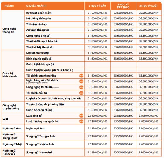 Các ngành như Công nghệ thông tin, Quản trị kinh doanh, và Công nghệ truyền thông có học phí cao hơn, khoảng 31,6 triệu đến 35,8 triệu đồng mỗi kỳ trong khi các ngành Ngôn ngữ Anh, Luật, Ngôn ngữ Nhật, Ngôn ngữ Trung Quốc có mức học phí thấp hơn, dao động từ 22 triệu đến 25 triệu đồng mỗi kỳ. Mức học phí này đã bao gồm chi phí học tập và quyền lợi sinh viên theo quy định của trường.