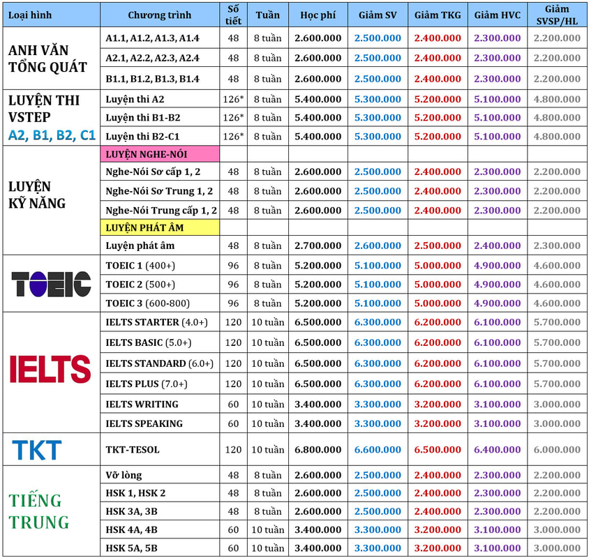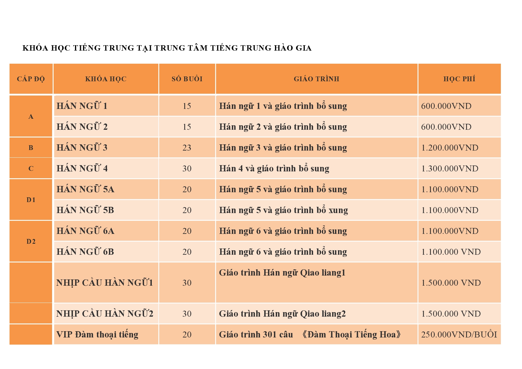 Khi tìm hiểu về bảng giá học phí tiếng Trung, bạn sẽ thấy có nhiều mức giá khác nhau tùy thuộc vào trung tâm và trình độ học. Đối với người mới bắt đầu, học phí thường dao động từ 1.500.000 đến 2.000.000 đồng cho một khóa học cơ bản. Các khóa học trung cấp và nâng cao có thể có giá cao hơn, thường từ 4.000.000 đến 5.500.000 đồng cho mỗi khóa. Điều quan trọng là phải xem xét chất lượng và uy tín của trung tâm để đảm bảo bạn nhận được giá trị tương xứng với số tiền bỏ ra.