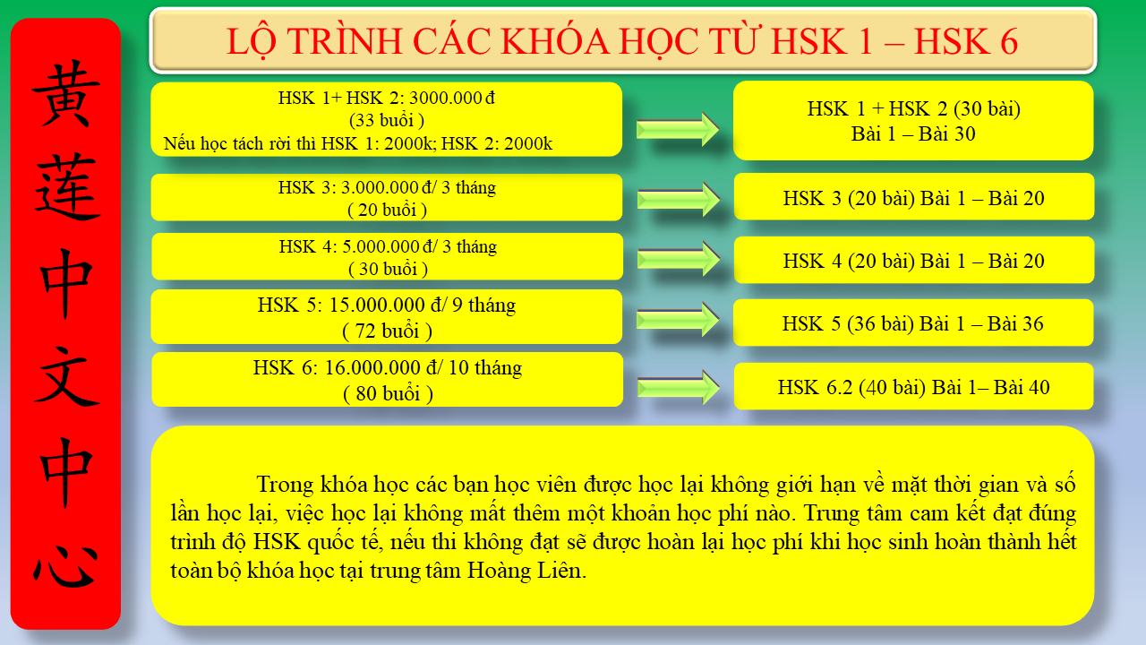 Học phí cũng thay đổi tùy theo trình độ và loại khóa học. Ví dụ, khóa học HSK 1 và 2 thường dao động từ 1.500.000 đến 2.000.000 đồng mỗi tháng, trong khi khóa học nâng cao như HSK 4 đến 6 có thể lên đến 5.000.000 đồng cho một khóa kéo dài vài tháng. Việc lựa chọn khóa học phù hợp với nhu cầu và ngân sách của bạn là rất quan trọng để đảm bảo hiệu quả và tiết kiệm.