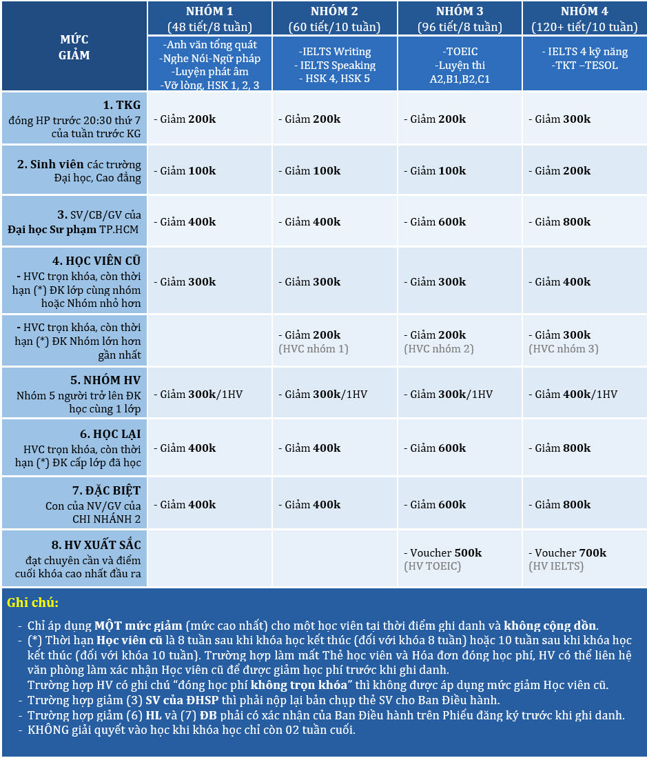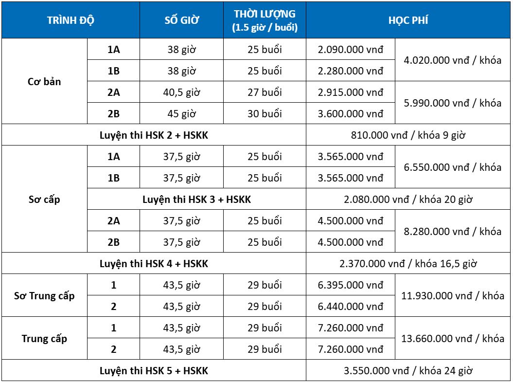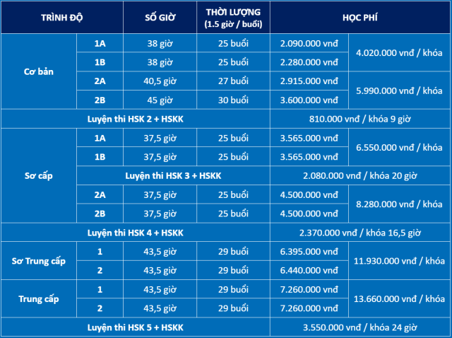 Đối với các khóa nâng cao như HSK 3, 4 hay 5, 6, học phí có thể cao hơn, thường từ 4 đến 5,5 triệu đồng mỗi khóa với thời gian học khoảng 4 tháng, cũng học 2 buổi mỗi tuần. Những lớp này thường yêu cầu trình độ đầu vào nhất định và có giáo trình chuyên sâu hơn.