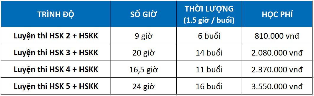 Với các khóa học theo chuẩn HSK, mức học phí sẽ tăng dần theo từng cấp độ. Chẳng hạn, khóa HSK 1, 2 thường có học phí từ 4 đến 4,5 triệu đồng/khóa, kéo dài khoảng 3–4 tháng, mỗi tuần 2 buổi. Các khóa nâng cao hơn như HSK 3, 4 thì học phí từ 4 đến 5 triệu đồng/khóa, còn HSK 5, 6 có thể lên tới 5–5,5 triệu đồng/khóa, thời lượng mỗi khóa khoảng 4 tháng. Nếu bạn muốn tiết kiệm hơn, có thể tham khảo các trung tâm tầm trung với mức học phí chỉ từ 500.000 đến 850.000 đồng/tháng, thậm chí có những khóa ưu đãi chỉ còn 399.000–499.000 đồng/tháng.