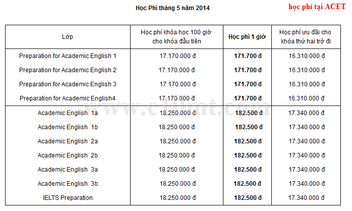 Ngoài ra, ACET còn có các khóa học tiếng Anh học thuật với mức học phí có thể lên đến gần 20 triệu đồng, phù hợp với những ai cần nâng cao kỹ năng tiếng Anh chuyên sâu hơn. Nếu bạn đang cân nhắc học tại ACET, nên xác định rõ mục tiêu và khả năng tài chính để chọn khóa học phù hợp nhất.