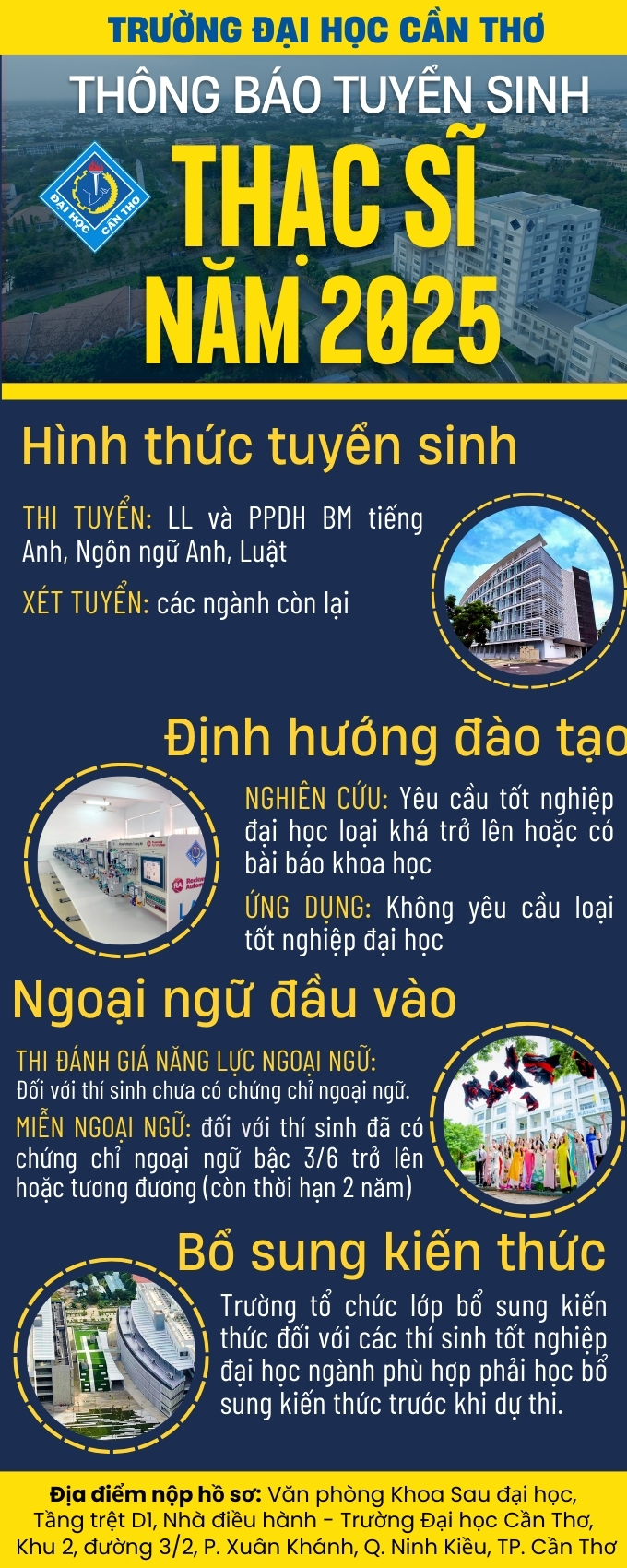 Ngoài ra, mức học phí này chưa bao gồm các khoản học ngoài giờ hành chính nếu có. Nhà trường cũng có quy định thu học phí quá thời gian đào tạo đối với học viên cao học nhằm đảm bảo tiến độ học tập. Điều kiện xét tuyển thạc sĩ tại Đại học Cần Thơ yêu cầu thí sinh có bằng tốt nghiệp đại học phù hợp và đáp ứng các tiêu chí ngoại ngữ theo quy định của trường.