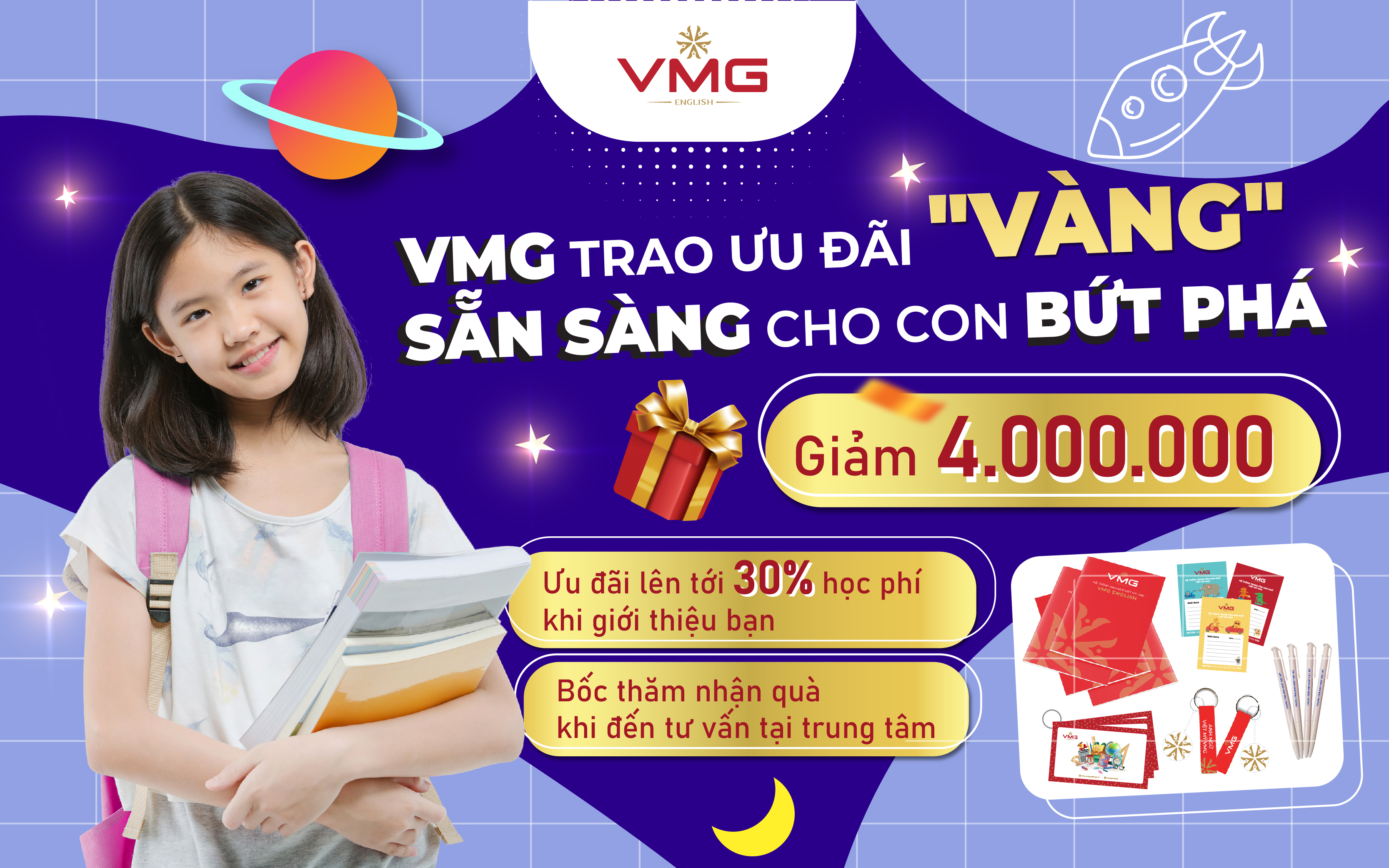 Trung tâm Anh ngữ Việt Mỹ (VMG English) mang đến cho học viên nhiều khóa học đa dạng, phù hợp với mọi lứa tuổi và trình độ. Từ các khóa tiếng Anh thiếu nhi như E-GENIUS dành cho trẻ 6-11 tuổi giúp phát triển kỹ năng giao tiếp và tư duy phản biện, đến các chương trình dành cho thiếu niên và người lớn như Anh ngữ giao tiếp, luyện thi IELTS, TOEIC, đều được thiết kế bài bản dựa trên hơn 20 năm kinh nghiệm giảng dạy.