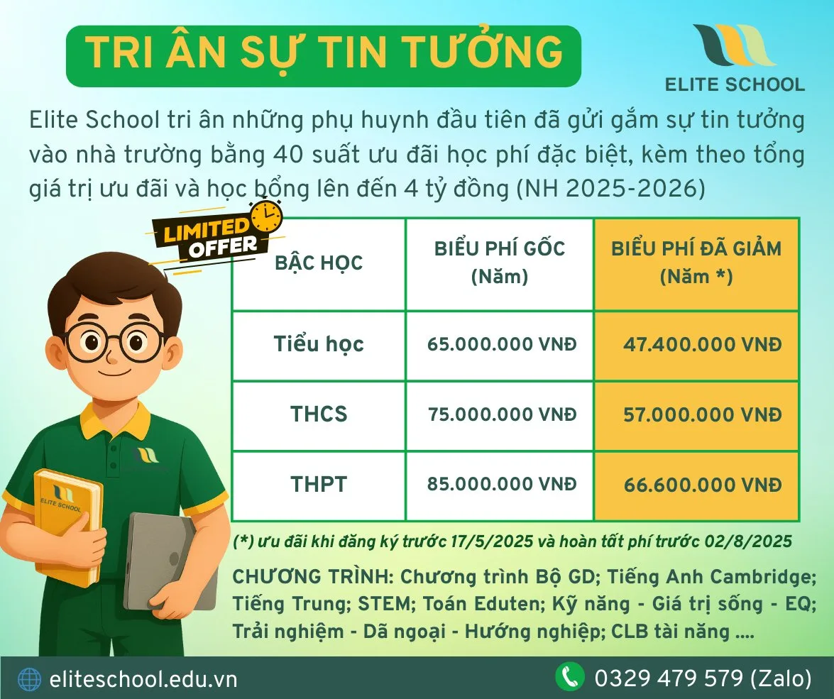 Ngoài ra, Elite thường có các ưu đãi giảm học phí khi học theo nhóm hoặc đăng ký nhiều khóa học cùng lúc, giúp học viên tiết kiệm chi phí. Với chương trình học được thiết kế bài bản từ mẫu giáo đến người lớn, học phí của Elite phản ánh chất lượng đào tạo và sự đầu tư vào giáo viên bản ngữ lẫn Việt Nam, tạo điều kiện tốt để người học phát triển tiếng Anh một cách toàn diện.