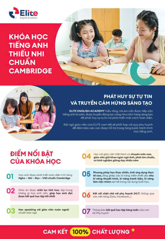 Lệ phí đăng ký này giúp trung tâm chuẩn bị tài liệu học tập, sắp xếp lớp học và các thủ tục hành chính cần thiết để học viên có thể bắt đầu khóa học thuận lợi. Ngoài ra, Elite còn chú trọng đến việc xây dựng môi trường học tập thân thiện, hiện đại với giáo viên Việt Nam và giáo viên bản ngữ phối hợp giảng dạy, giúp học viên tiếp thu tiếng Anh một cách tự nhiên và hiệu quả.