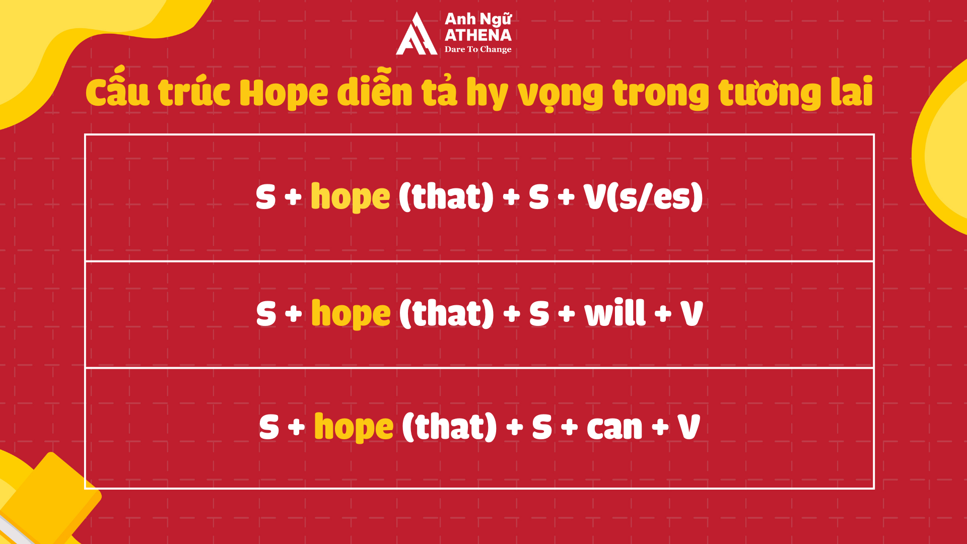 Ngoài ra, khi sử dụng “hope”, cấu trúc cơ bản thường là S + hope (that) + S + V, hoặc S + hope + to + V-infinitive. Ví dụ, “I hope (that) my team wins” thể hiện sự kỳ vọng vào tương lai. Rõ ràng, “hope” không chỉ đơn thuần là mong chờ, mà còn thể hiện niềm tin và khát khao cho điều tốt đẹp.