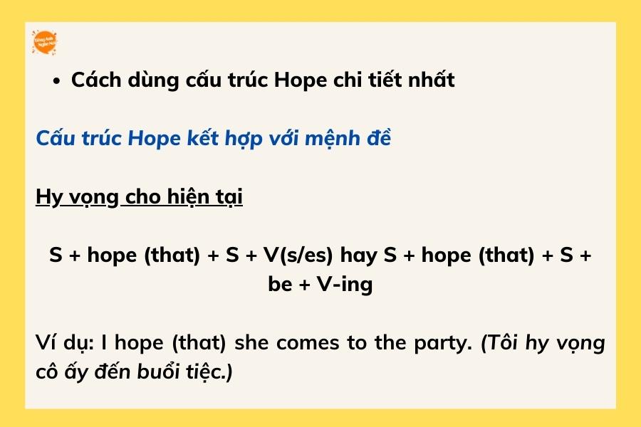 Trong tiếng Anh, từ “hope” thường được sử dụng để diễn tả những mong muốn, kỳ vọng về một điều gì đó có thể xảy ra trong hiện tại hoặc tương lai. Khi nói về điều này, chúng ta có thể sử dụng cấu trúc “hope + that + S + V”. Ví dụ: “I hope (that) it doesn’t rain,” có nghĩa là tôi mong rằng trời sẽ không mưa.