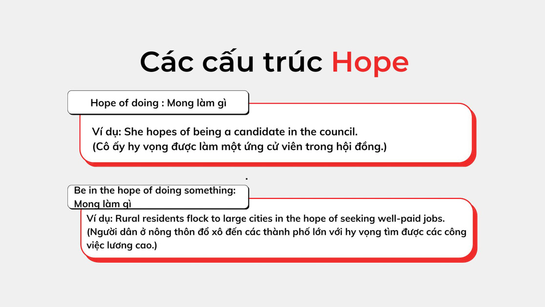 Ngược lại, “hope V-ing” ít được dùng hơn và thường không thể hiện rõ ràng mục tiêu cụ thể mà người nói đang mong muốn. Hy vọng chỉ ra rằng “hope” mang nghĩa hy vọng, kỳ vọng về điều gì đó có thể xảy ra, và thường đi kèm với cấu trúc “hope to V”.