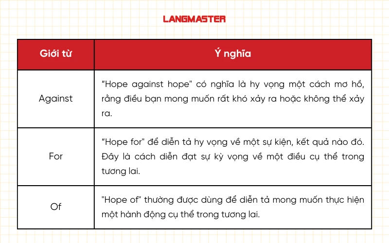 Ngoài ra, “hope” cũng có thể kết hợp với giới từ khác như “against” để diễn tả hy vọng hão huyền, nhưng khi muốn thể hiện sự tin tưởng hơn vào một điều gì đó khả thi, “hope for” là lựa chọn chính xác. Chúng ta cũng thường sử dụng cấu trúc “hope that” để diễn đạt ý nghĩa mong muốn về tương lai, ví dụ như “I hope that my team will win the match.”