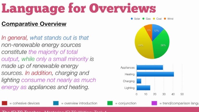 Việc viết một overview là rất quan trọng khi bạn muốn tổng hợp thông tin từ một biểu đồ, biểu đồ hay quy trình. Đầu tiên, hãy bắt đầu với một câu kết nối như “Tóm lại” hoặc “Nhìn chung” để giới thiệu bức tranh tổng thể về dữ liệu. Câu đầu tiên nên diễn đạt lại thông tin chính một cách ngắn gọn và dễ hiểu, giúp người đọc có cái nhìn tổng quát.